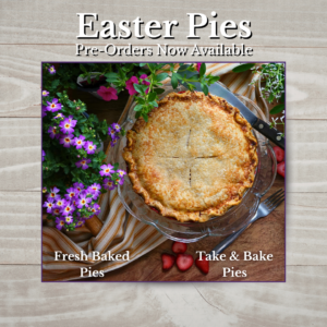 Easter pie orders are now available in our web shop. Pick up on the Friday or Saturday before Easter. We will be closed on Easter Sunday.